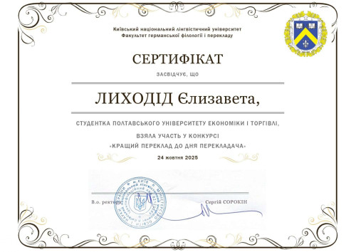 У жовтні 2025 року студентки другого курсу першого (бакалаврського) рівня Тамара Серікова та Єлизавета Лиходід взяли участь у Конкурсі перекладів - 2025 до Міжнародного дня перекладача, який організувала кафедра теорії і практики перекладу з англійської мови Київського національного лінгвістичного університету.