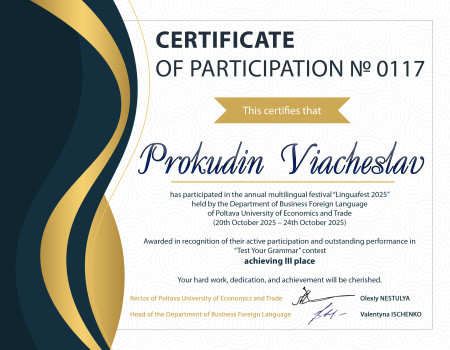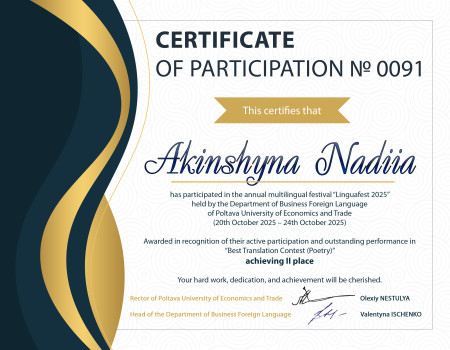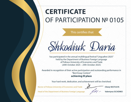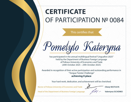Кафедра ділової іноземної мови Полтавського університету економіки і торгівлі щиро вітає переможців конкурсу на краще есе How learning another language has changed my world, який відбувся в рамках щорічного фестивалю кафедри Linguafest 2025. У конкурсі взяли участь студенти університетів та учні ЗЗСО м. Полтави, які продемонстрували свій талант, креативність і любов до англійської мови у своїх есе.
