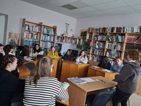 Потім разом зі студенткою четвертого курсу першого (бакалаврського) рівня освіти спеціальності 035.041 Германські мови та літератури (переклад включно), перша – англійська Оксаною Зелененькою учні відпрацювали навички послідовного усного перекладу з англійської на українську мову.