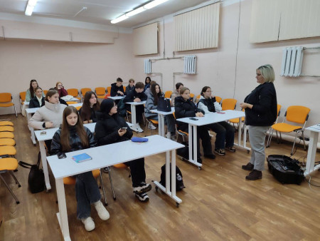 Доцент кафедри ділової іноземної мови Валентина Воскобойник в інтерактивній формі познайомила старшокласників з особливостями роботи перекладача, видами перекладу, специфікою виконання усного та письмового перекладу, окреслила вміння, які необхідні перекладачеві для професійного перекладу.