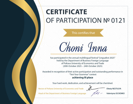 Кафедра ділової іноземної мови Полтавського університету економіки і торгівлі щиро вітає переможців конкурсу на краще есе How learning another language has changed my world, який відбувся в рамках щорічного фестивалю кафедри Linguafest 2025. У конкурсі взяли участь студенти університетів та учні ЗЗСО м. Полтави, які продемонстрували свій талант, креативність і любов до англійської мови у своїх есе.