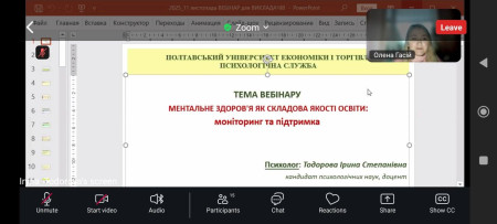 11 листопада 2025 року викладачі кафедри ділової іноземної мови доцент Іщенко В.Л., доцент Воскобойник В.І., старший викладач Горбуньова С.О. разом зі студентами освітніьої програми "Філологія " взяли участь у вебінарі "Ментальне здоров’я як складова якості освіти: моніторинг та підтримка». Під час вебінару поговорили про те, як ментальне здоров’я впливає на якість освіти; про сучасні підходи до моніторингу психологічного стану; а також про інструменти підтримки викладачів і студентів.
