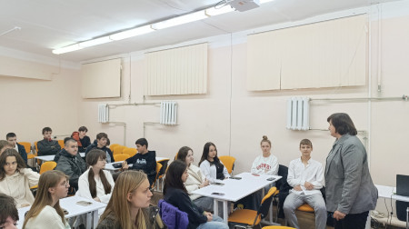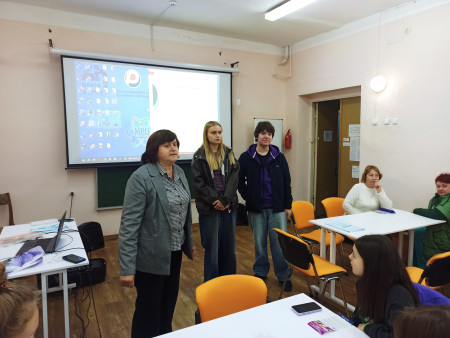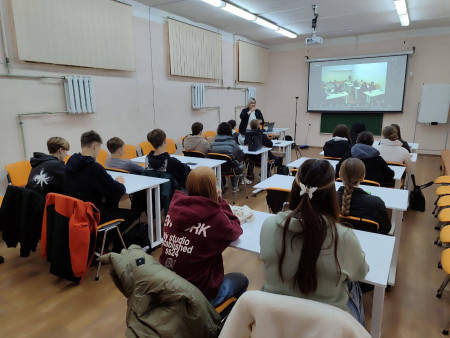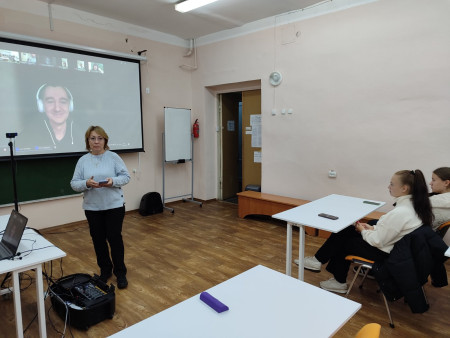 Доцент кафедри ділової іноземної мови Валентина Воскобойник в інтерактивній формі познайомила старшокласників з особливостями роботи перекладача, видами перекладу, специфікою виконання усного та письмового перекладу, окреслила вміння, які необхідні перекладачеві для професійного перекладу.