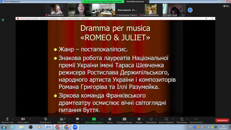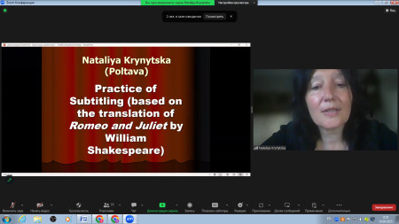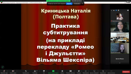 Наталія Криницька поділилася власним досвідом створення англомовних субтитрів до вистави «Romeo & Juliet» Івано-Франківського національного академічного драматичного театру ім. Івана Франка (режисер-постановник – народний артист України Ростислав Держипільський). Це постапокаліптична версія трагедії Шекспіра в експериментальному форматі, яка не завжди віддзеркалює англомовний оригінал, тому створення субтитрів вимагало імітації перекладачкою ідіостилю Шекспіра.