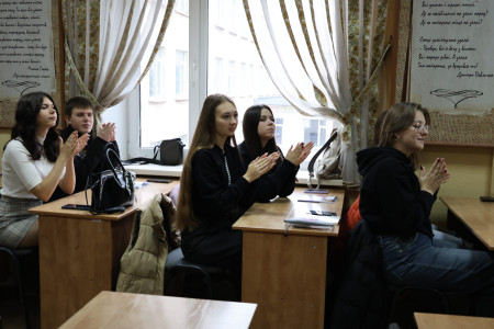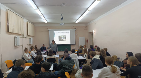 30 вересня традиційно відзначають Міжнародний день перекладача. Із метою популяризації професії перекладача в Полтавському університеті економіки і торгівлі за ініціативи кафедри ділової іноземної мови був організований майстер-клас «Перекладацька майстерня» для студентів університету спеціальності “Філологія” та учнів 10-Б класу філологічного профілю Ліцею № 26 «Шевченківський» Полтавської міської ради, які разом з учителями іноземних мов Оленою Кириченко та Ілоною Моісеєнко завітали до ПУЕТ в цей день.