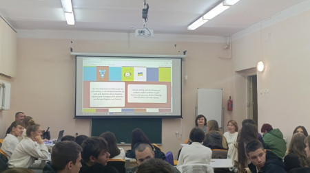 Студентка Кароліна Дажук цієї ж спеціальності розповіла учням про університет німецькою мовою та запропонувала їм вікторину німецькою мовою.