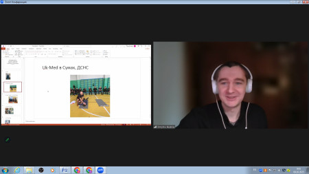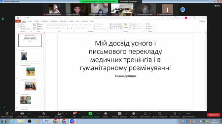 Дмитро Бодня поділився своїм досвідом роботи в якості усного перекладача в міжнародних гуманітарних організаціях UK-Med та HALO Trust. Він розповів про специфіку роботи в міжнародних організаціях, особливості роботи усного перекладача та складнощі усного перекладу. Він також наголосив на важливості використання компю’терних систем перекладу в роботі перекладача.